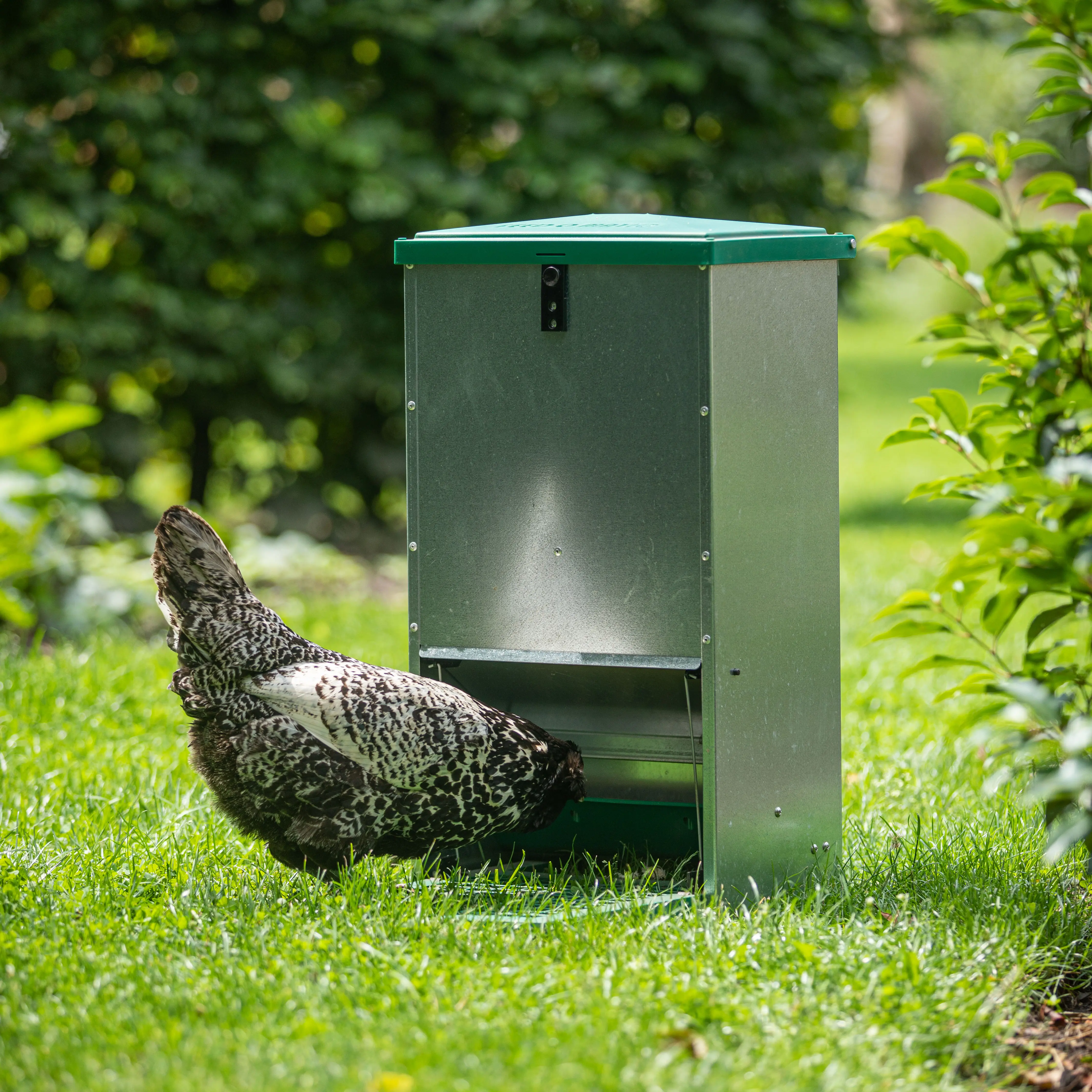 Een ander vaak gehoord voordeel van een trapbak is het feit dat deze grote hoeveelheden voer kan bewaren. Kippen kunnen zo een tijd vooruit, zonder dat het voer dagelijks moet worden bijgevuld. Als er toch bijgevuld moet worden, onderscheidt de Feedomatic zich andermaal. De volledig geopende deksel blijft zelfstandig staan, waardoor beide handen vrij zijn om het voer in de bak te gieten. Sluit het deksel hierna en deze vergrendelt automatisch. Ideaal en bewezen effectief.