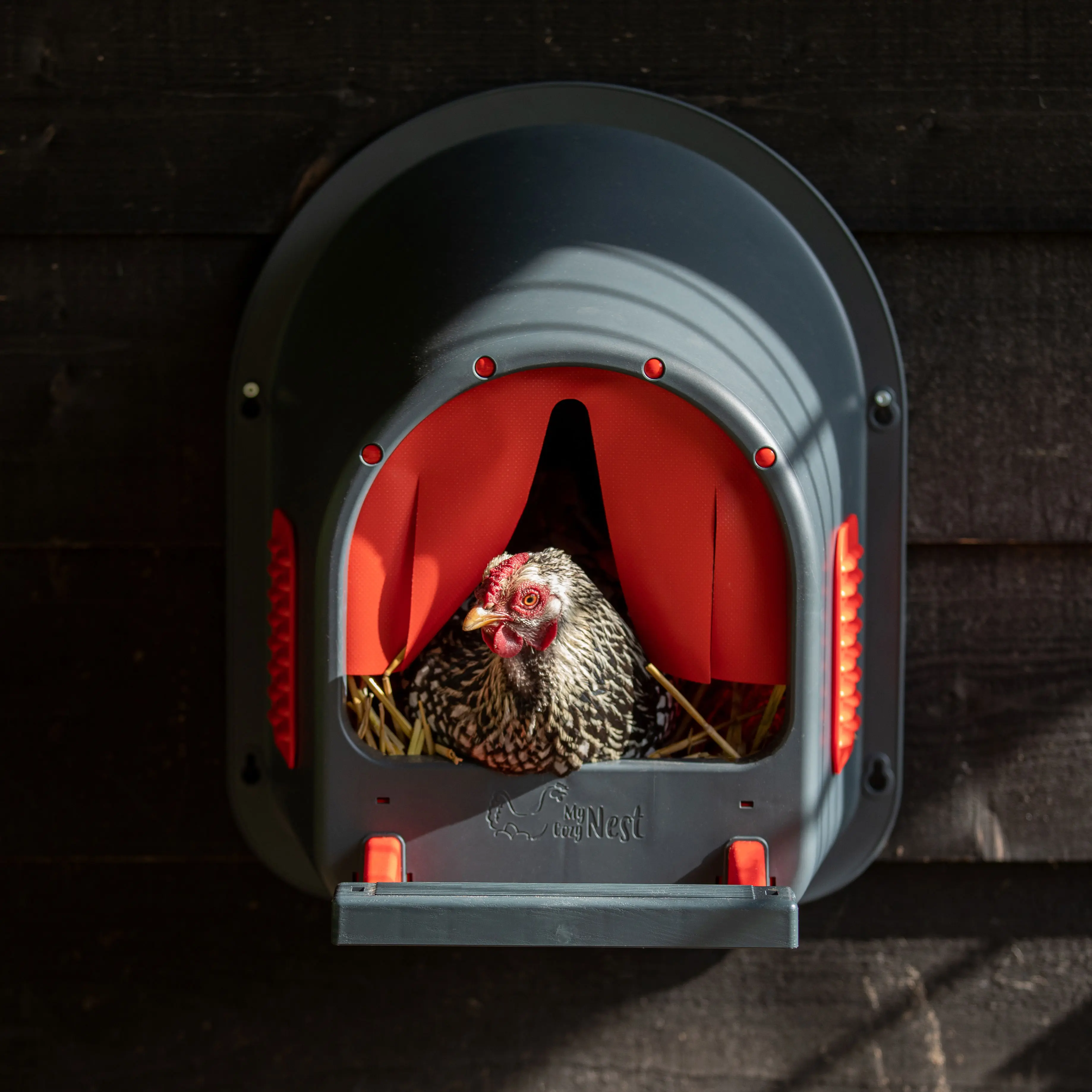 MyCozyNest betekent een comfortabele plek voor kippen van elke soort en maat. Het verduisteringsgordijn én de innovatieve ventilatieopeningen zorgen voor de benodigde donkere, beschutte plaats voor het leggen van eieren. Dankzij het gebruik van hoogwaardig slagvast polypropyleen heeft dit product een uitstekende levensduur. De vorm van het nest zorgt er bovendien voor dat deze zeer gemakkelijk schoon te maken is.